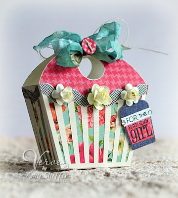 The cupcake tote is a cut file designed by Lori Whitlock for the Silhouette store. I enlarged the pieces by 125%, then cut them on my Silhouette out of a combination of ivory card stock and papers from Crate Paper's Random collection. I tied the top closed with some jute string, added some crinkled and dyed seam binding, then topped it with a red checked button (to look like a cherry on top). I further embellished with some paper flowers and a small tag that I die-cut with Verve's Tiny Sweet Sallop Die Set. On the tag I added a sentiment using stamps from the Birthday Bash stamp set.