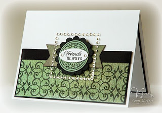 Everyone should own a few stamps that are so striking and beautiful they pretty much stand on their own. Artful Elegance is one of those sets for sure -- simple elegance at its best! The scroll pattern in this set reminded me of the ornate wrought-iron fencing that surrounds the historic homes and immaculate gardens of the French Quarter in New Orleans. I chose my earthy greens with those gardens in mind, then added black satin ribbon and a little bling to finish off my more formal look.