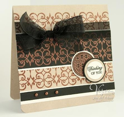 the Artful Elegance set twice in VersaMark. I then sprinkled bronze embossing powder and heat embossed. I then created the other heat embossed pieces with the same bronze embossing powder on black paper. I really like this color combo, as I think it would be perfect for many occasions including everyday cards, birthday, wedding and sympathy.