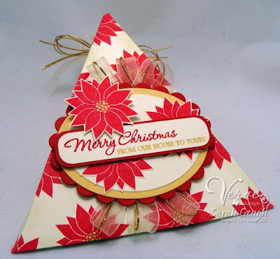 Today I have some more awesome stuff to show you! This time, we're featuring the work of Guest Diva Sarah Gough. After seeing some of Sarah's Verve creations, we knew she needed to be a Guest Diva for us!The first project I'm featuring today is Sarah's Triangle Box using Poinsettia Christmas. I love how she created depth with the circles and cut out flowers, and the multi-colored sentiment is to die for! I think my favorite part, though, is the ribbon treatment. The white sheer ribbon paired with gold cord is totally STUNNING!