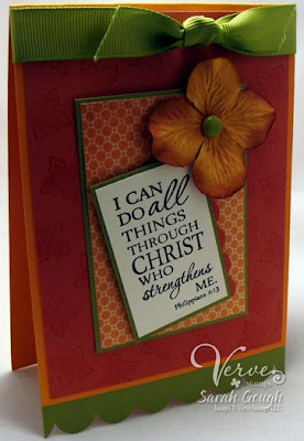 Sarah's final project is this gorgeous card using the Philippians 4:13 Plain Jane stamp. I adore how she coordinated the colors of her project with the colors of the Prima flower. The most awesome thing about this card, though, is that the ATC sized layer with the scripture is detachable, so you can carry it around with you! How GENIUS is that? Love it.