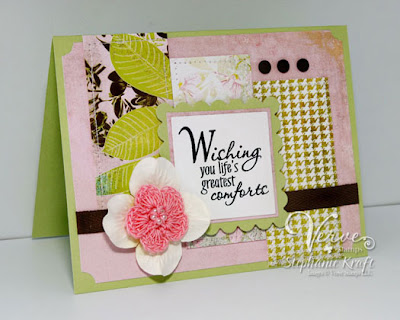 Thanks for visiting on day two of our Guest Diva Spotlight. Today we're highlighting the work of our fabulous guest, Stephanie Kraft. Stephanie has been a faithful follower of Verve challenges and Mojo Mondays, and her clean, fresh style totally stood out to us! I love her color choices and the way the stamps totally show off her style. You can see more of Stephanie's work on her blog - HandKrafted by Stephanie.When Stephanie sent me this card using the Comfort Plain Jane, it literally took my breath away. I absolutely adore the colors she chose (which would totally brighten someone's day!), and the pops of brown, stitching, and crochet flower...all perfect touches!