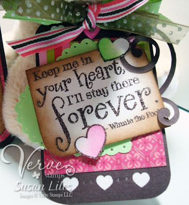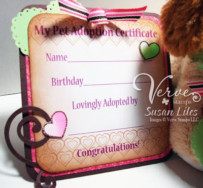 Ever since I received the "Hundred Hearts" set from Verve, I knew this particular quote needed to be associated somehow to a warm, cute and furry little puppy! So when I found out that Jen's Project Parade Challenge would be "A Kid at Heart", I couldn't help myself but to follow through with my concept. Earlier in the day, my girls were playing with their Webkinz and that spurred the idea of the Adoption Certificate to go along with the puppy. Hence, I've invented a "Verve-kinz" puppy! (as opposed to Webkinz. If you have young girls, you know what these are!) During the Christmas holidays, I stayed on the lookout for a furry little friend for this project and decided to take this sweetie home from Party City for $1! She had a Christmas bow on her, but I "redressed" her with her new tag and fresh bows to match.