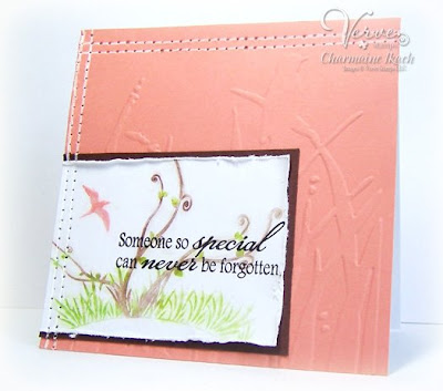 I also thought the Bird Call Cuttebug folder went well with this particular image. In the stamped image, the bird is in flight while in the Cuttlebug embossed image, the bird has landed and is still. I think you'll find that the sentiments in this set are PERFECT for making cards for those going through difficult times.
