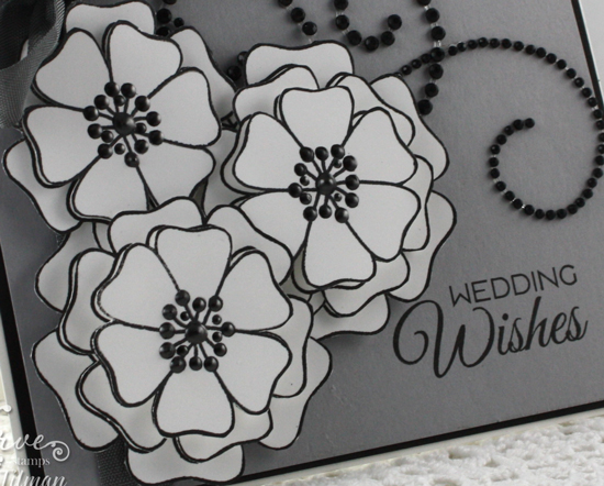 I thought the flowers looked so elegant that I left them uncolored and decided to use them to make a wedding card for some friends of ours. The wedding wishes sentiment is from Love Story and stamped directly onto a layer of smoky slate cardstock. I absolutely adore the way Andrea adds bling to her projects, so I had to add a little bling flourish to this card. I finished off with a seam binding bow from the Stormy Skies Collection and accented all of the flower centers with onyx liquid pearls.