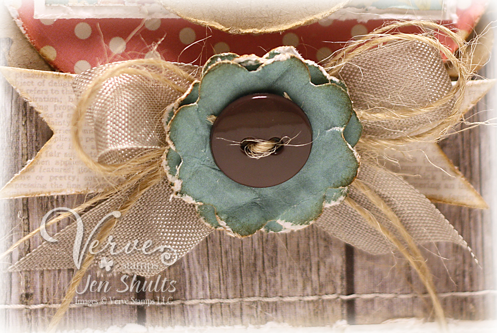 Now for the Verve goodies that I used. The stamps set is Brighter Days. I accented it with a flower made from the smallest flower in the Goodness Flowers Die Set which is layered on a bit of twine thread, Signature Ribbon Collection grey seambinding and two flags from the Flag It Die Set.