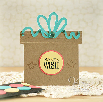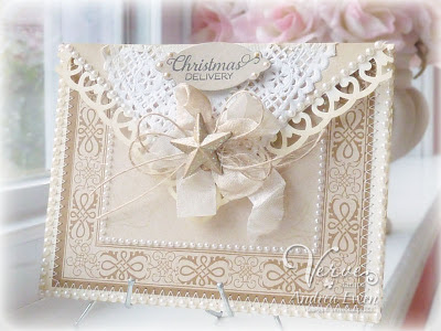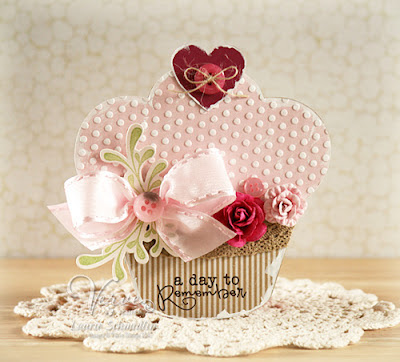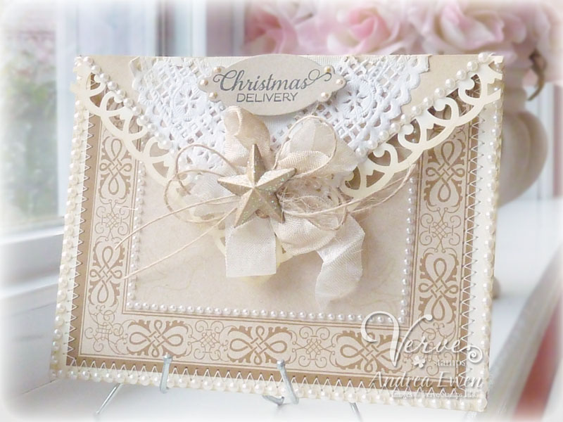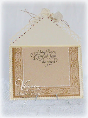 The base is made from die cut Scalloped Grand Nestabilities layered together for a clamshell type opening. I sponged the scallops with Vintage Photo ink and then added some more liquid pearls. The finished size of the card is 5.5" in diameter.