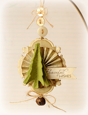 The lines between shabby chic and mixed-media always seem to blur when I'm working in my style, so I started by using a piece of punchinella (sequin waste) as a stencil to add some white paint dots to the soft sky vertical panel. I then layered the doily on top of this, adding a bit of distressing with antique linen and vintage photo ink. These panels are adhered to some brown paper bag cardstock that I stamped with the straight loopy border from On Occasion, then I cut the whole thing with the Circles Grand Nestabilities.