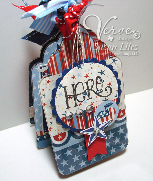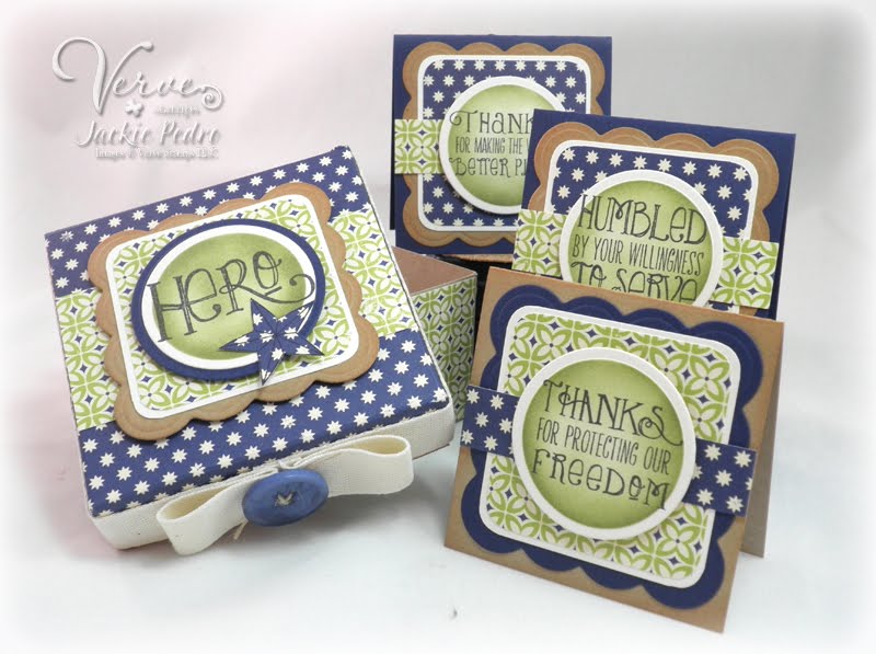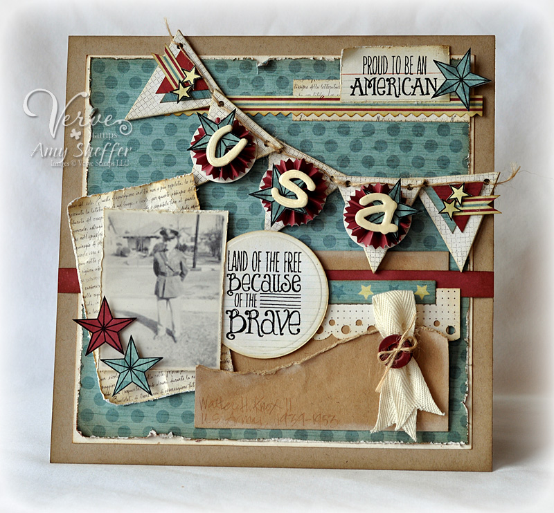 I couldn't help myself...as soon as I heard 'stars and stripes' my brain automatically went to the good ol' red, white and blue...so I went with it! The main sentiment is from a previously released Verve set called American Hero. I stamped that on a white panel and raised it up on a Occasion Frame die. I stamped the frame from the On Ocassion set and then heat embossed with white embossing powder. The blue and white star strip were cut with a Verve Ribbon Banner die and the left and right sides were stamped with a border from the Strong Anchor set. At the bottom, I stamped 'thank you for all you do' from the Teacher's Count set, because really that would work for anyone you're thankful for. Lastly I added some stars which were cut out using Verve's Starry die set.