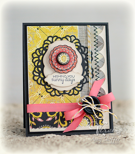 If you want to kick this month's dare up a notch, you can add a flower cluster as per Diva Andrea, or go with a "sweet" theme as per Diva Christyne's blog name "Stamping with Sugar". These are not required elements, but fun options should you wish to use them. Just remember to use at least one Verve product on your creation!