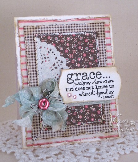 It was a joy to focus on the styles of Julee and Teresa this month :)  Julee's beautiful spirit just oozes from each and every sentiment and image she creates.  I don't know why, but when I was looking through all my Verve sentiments, I stopped at this Grace Plain Jane and looked no further.  I just knew this was the sentiment I had to use.  This was the one that at that moment reminded me of Julee.  Always graceful, uplifting, sweet and real.  Enter Teresa's gorgeous shabby, vintage style and I knew I had to add some great papers, lots of distressing, delicious ribbon and a touch of lace. Something pretty and special, just like Teresa.  Now, this card has another special purpose.  A colleague and his wife had a a baby over a year ago and named her "Grace."  I've been meaning to make them a card with this sentiment ever since its release.  So now I have!  I'll be popping it into the mail ASAP for a fun surprise :)