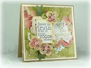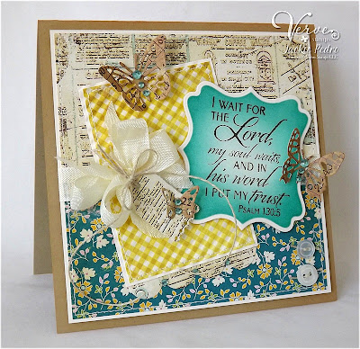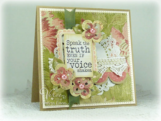 This month's dare pays tribute to Julee (Poetic Artistry), owner and creator of Verve Stamps and Diva Teresa (Paperie Blooms). Julee has created countless, uplifting sentiments which have become one of Verve's trademarks, and Teresa knows how to rock distressing and "shabbiness" on her cards. So what we're daring you to create this month is a card using an uplifting sentiment and some distressing and/or shabby element to it. Kind of like an encouraging card you have received which you have read so many times the edges are a bit tattered. Just remember to use at least one Verve product on your creation!