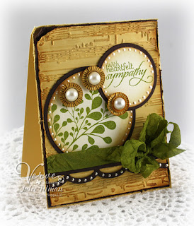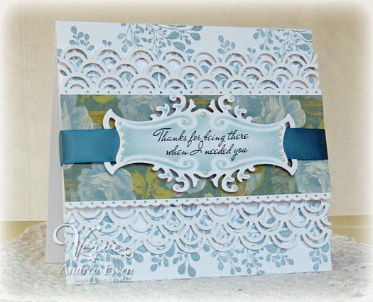 To created the scalloped edge I used the Flourish Trim Die. The sentiment is die cut with the Classy Label Die.