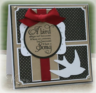 Julee never ceases to amaze me with each new release!! And this time she included one of my all time favorite images: swans. My heart went all aflutter when I saw the set Swan Song. I'm so excited to be able to work with this new release. For this card, I stamped the swan and sentiment with Smokey Gray (Versafine) and paper toled the swan with 6 layers. I created the sentiment medallion with the Lattice Pendant, Labels 3 and Circle Nestabilities, and added some sparkle to each piece with some glitter. Finally, I topped it all off with some sewing, pearls, and a large Ivory bow.
